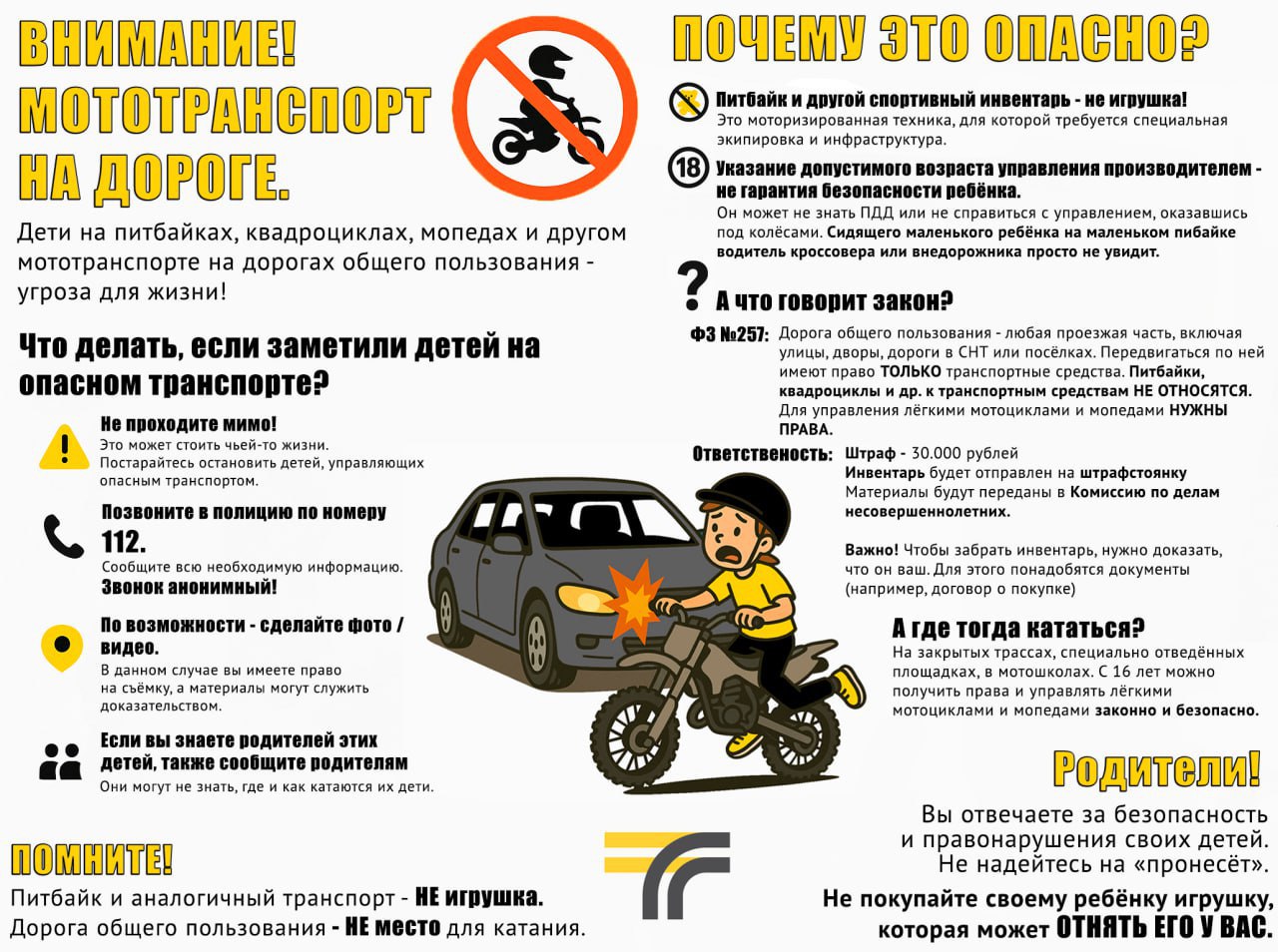 🔔Уважаемые водители питбайков, квадроциклов, мопедов и других мототранспортов! Помните, что ваша безопасность – в ваших руках. Будьте внимательны, соблюдайте правила, не рискуйте понапрасну.