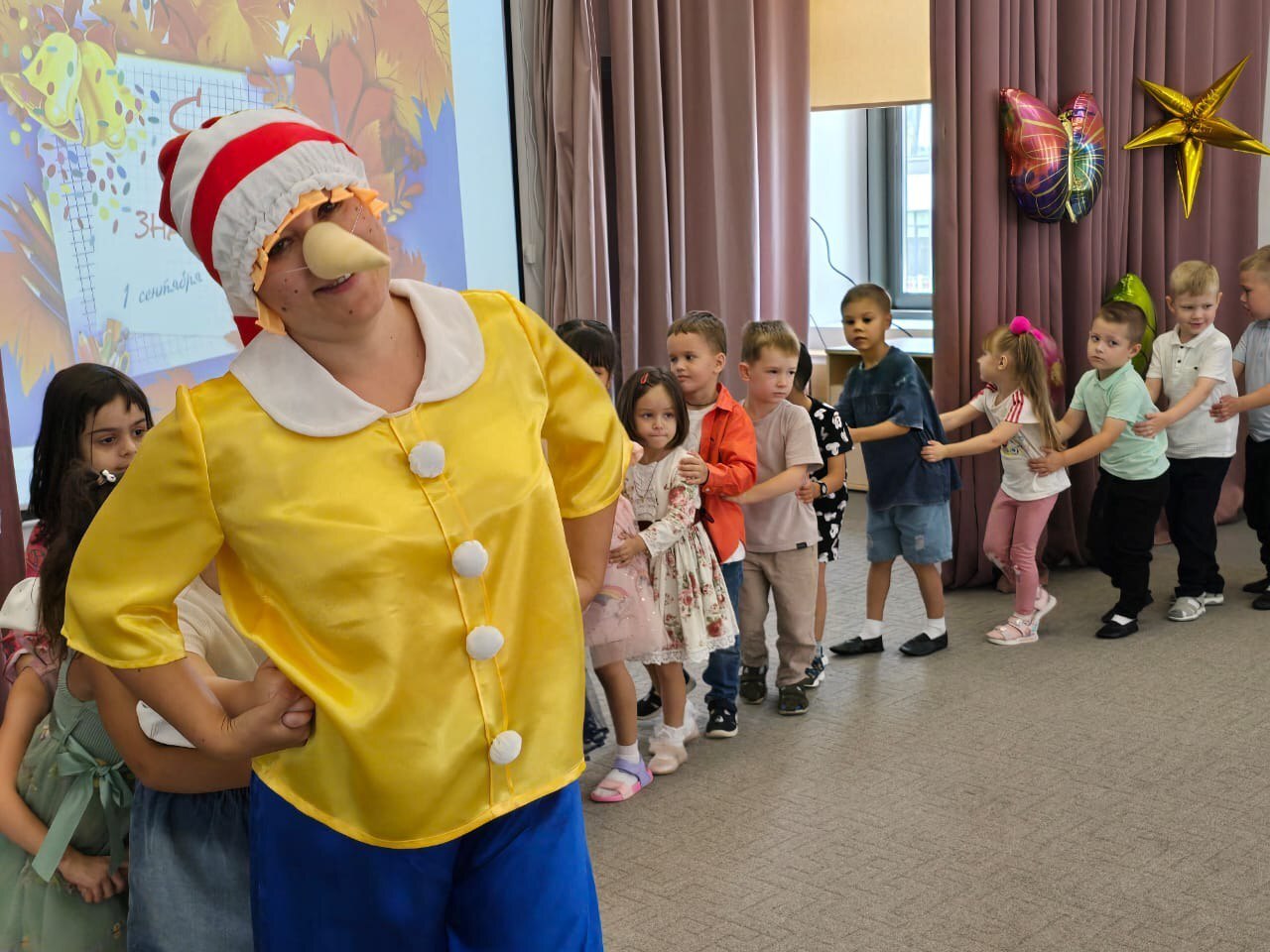 Веселый праздник, где в гости к ребятам пришли Буратино и Мальвина.
